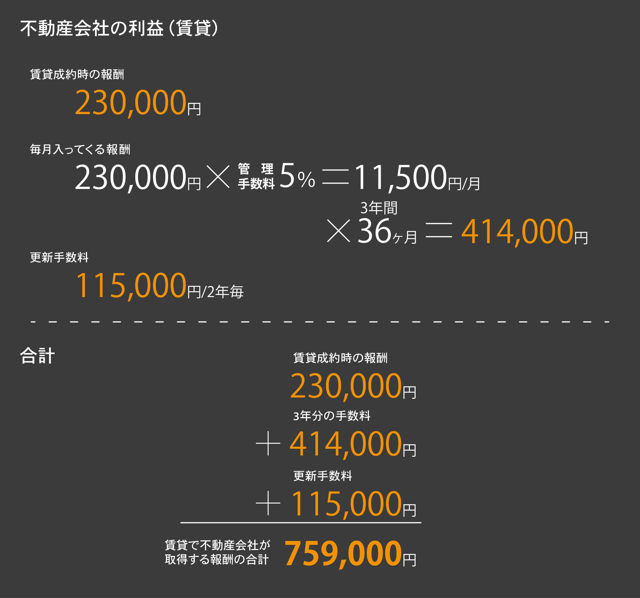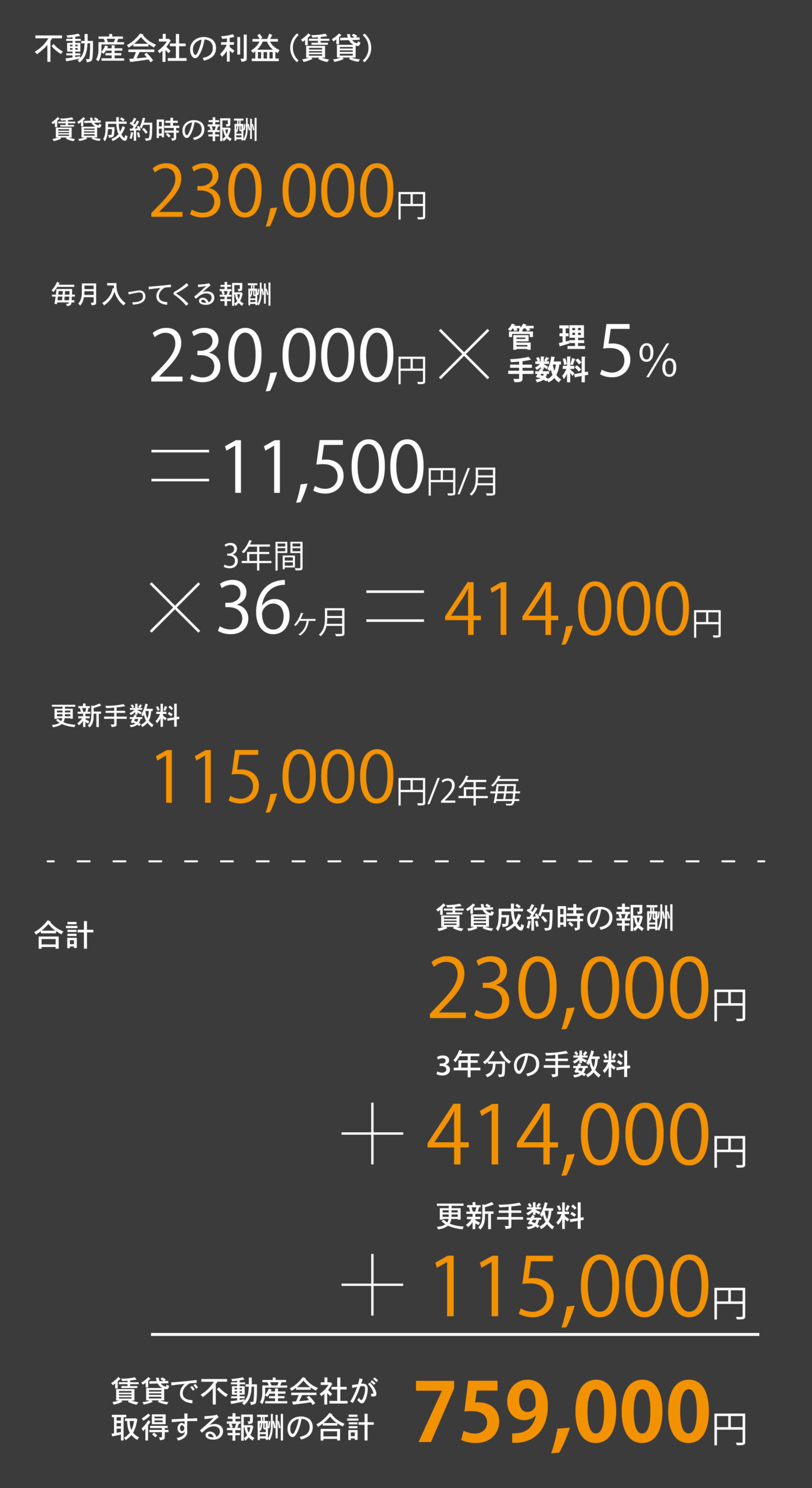自社で借主を見つけてきた場合は+仲介手数料として230,000円なので989,000円となります。