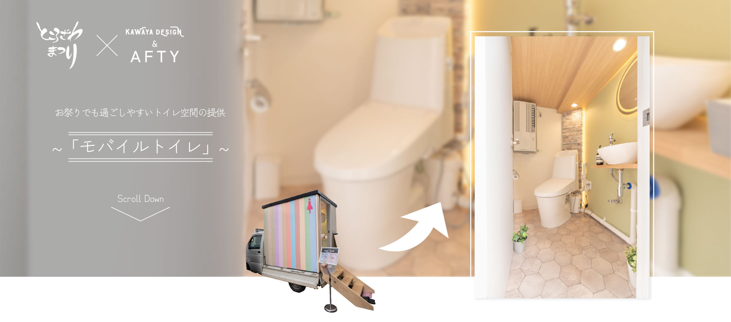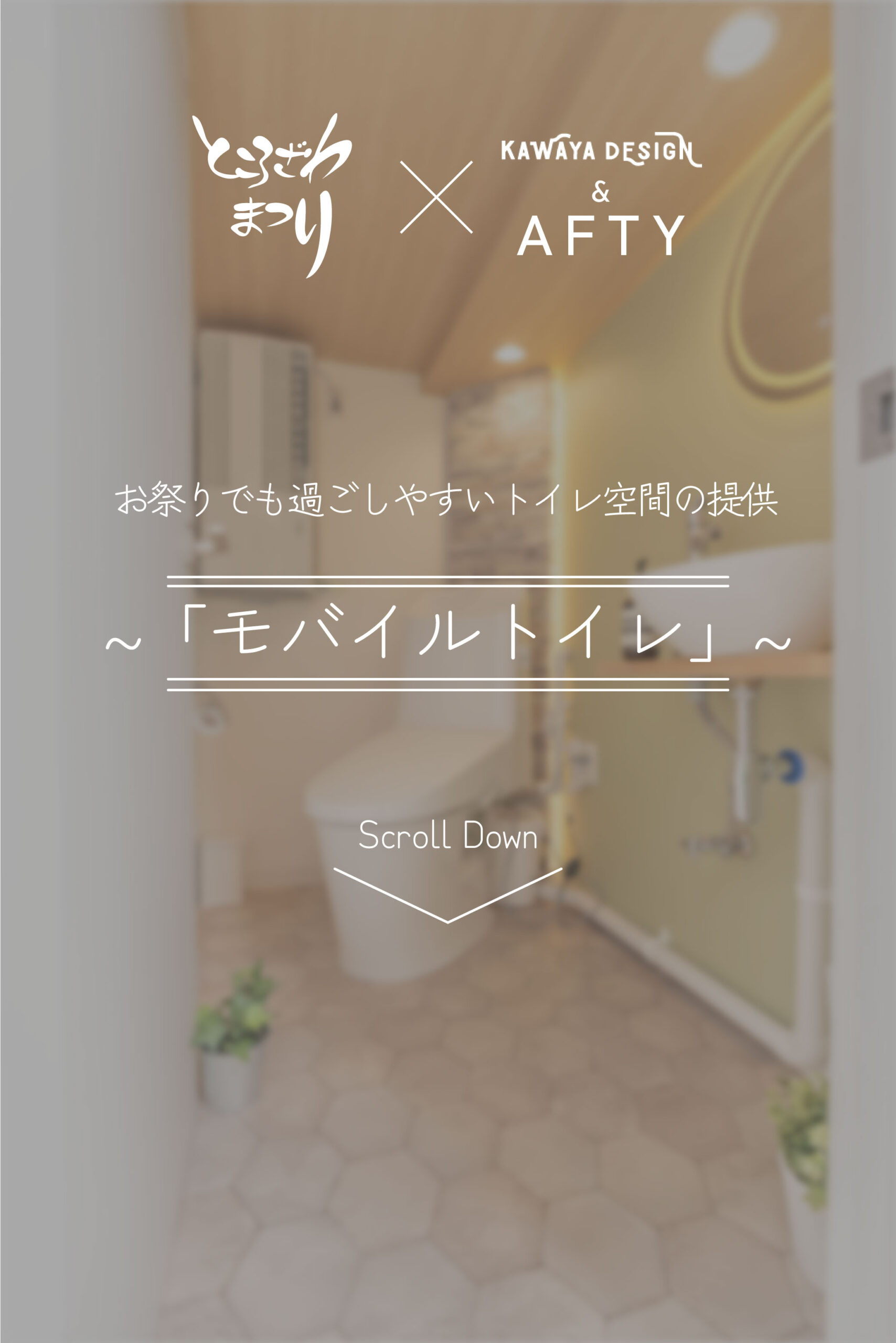 本プロジェクトはAFTY(株式会社bELI)と KAWAYA DESIGN(有限会社石和設備工業)が 共同で制作した移動可能なトイレ設備です。一般的に公共トイレと言えば「汚い・臭い・怖い」。そんなイメージを払拭したく、本プロジェクトが始動しました。デザイン、意匠はAFTYが担当し、長年の経験からトイレ、水回り関係の施工に長けている石和設備工業が施工を担いました。せっかくならとKAWAYA DESIGNの地元である所沢市の皆様に 我々の取り組みを知って頂きたく、 モバイルトイレを東京都所沢市が主催の2023年10月8日に開催される「ところざわまつり」に参加させていただくことに決定しました。