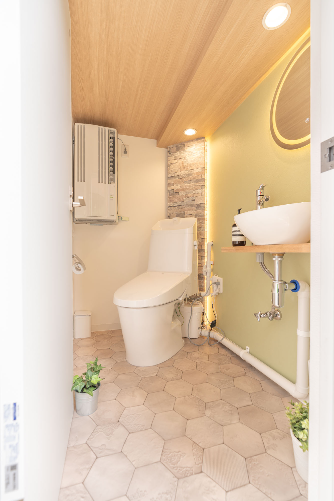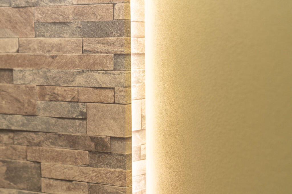 ②アクセントクロス:トイレの壁面に凹凸感のある石目調ランダムストーンレンガのアクセントクロスを配置し、クロスの背後両端からラインライトで明かりをつけ、空間を際立てています。