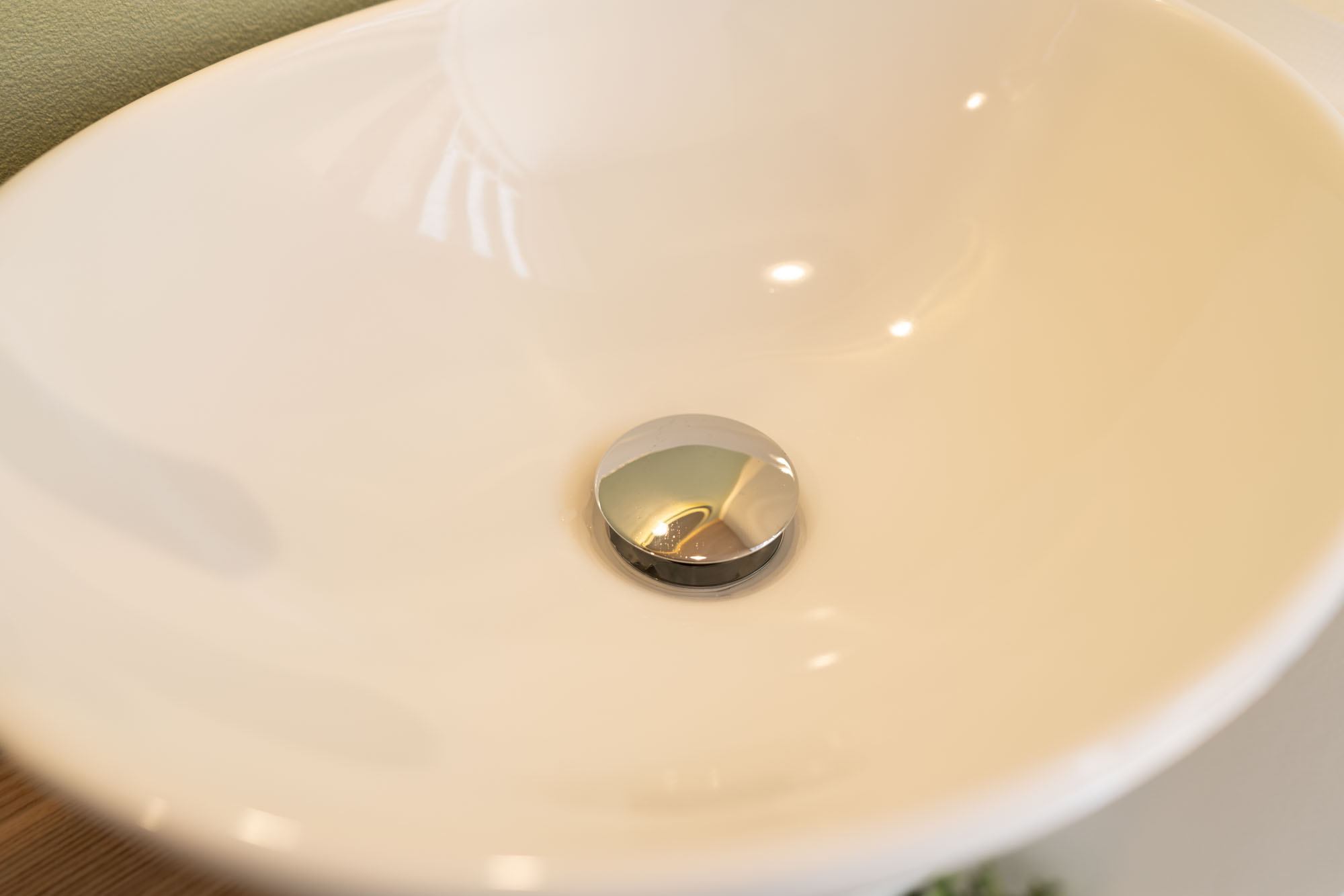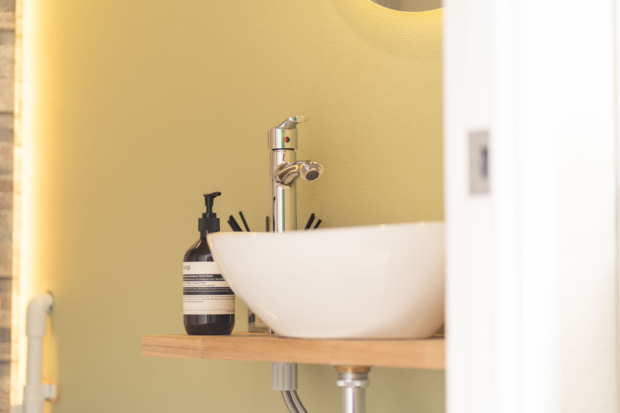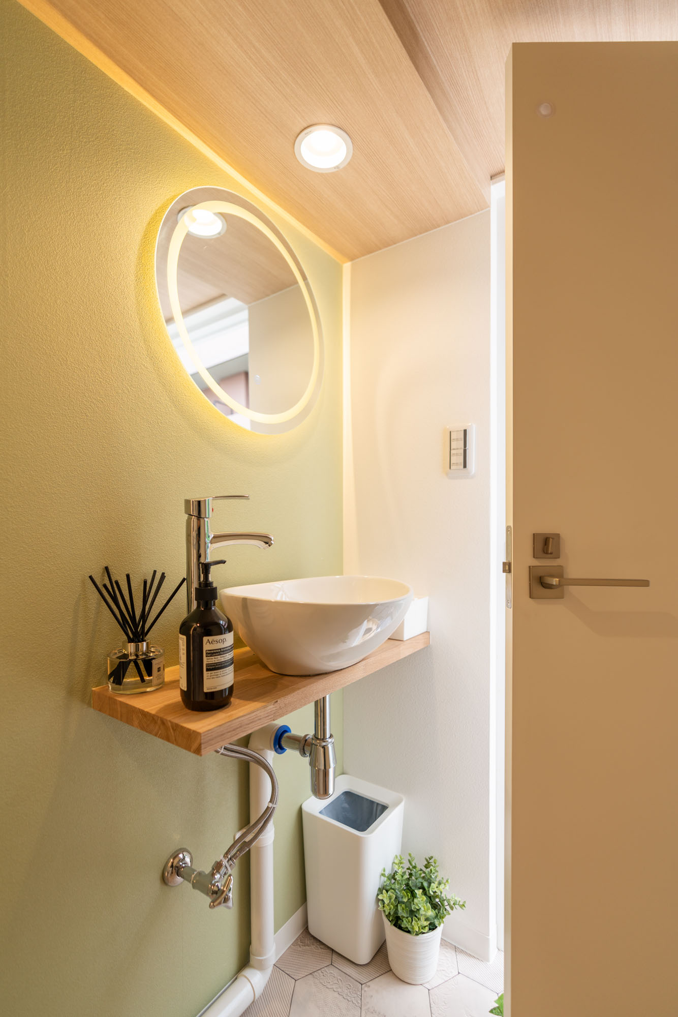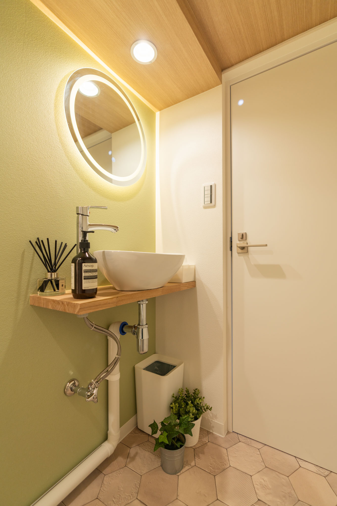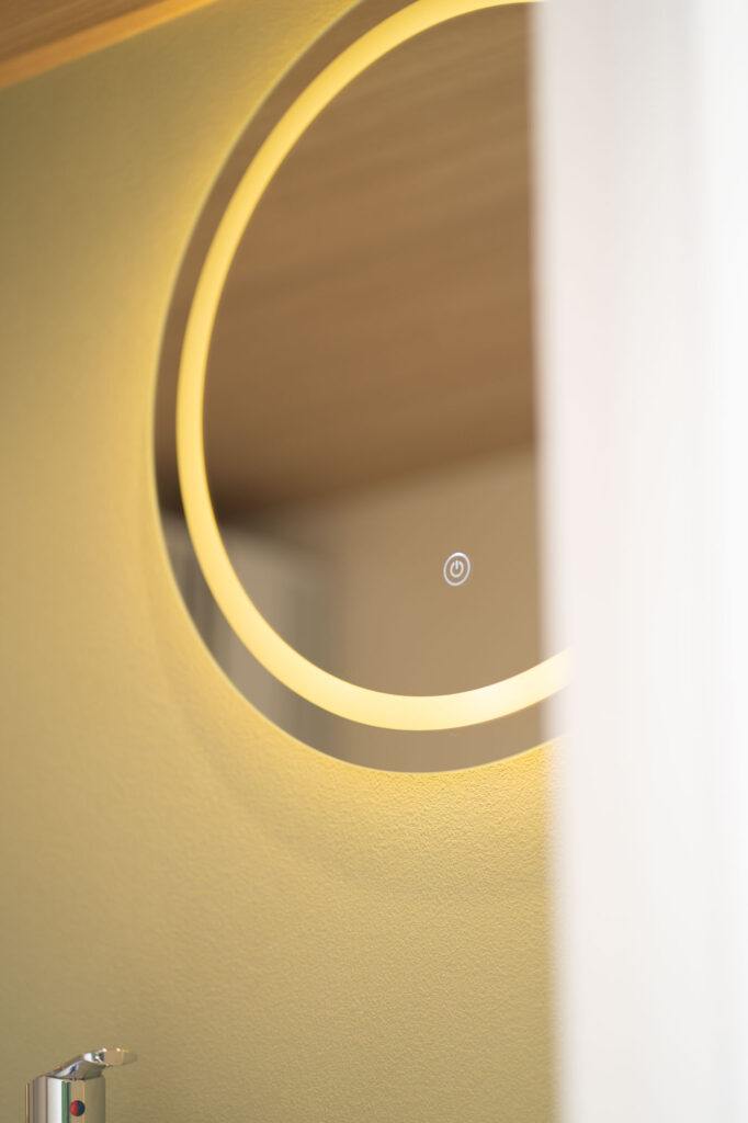 ④洗面エリア:デザイン性を保ちつつ、限られた空間を最大限に活用するため、ミニマルな洗面セットと円鏡を採用。簡単なお化粧直しなどにも利用いただけます。