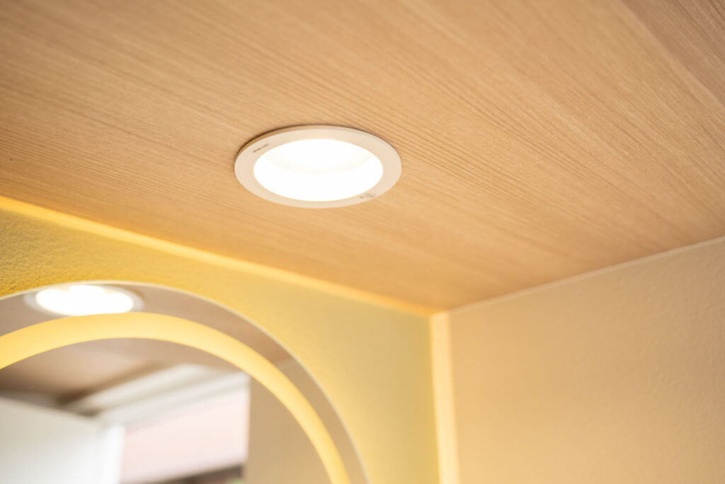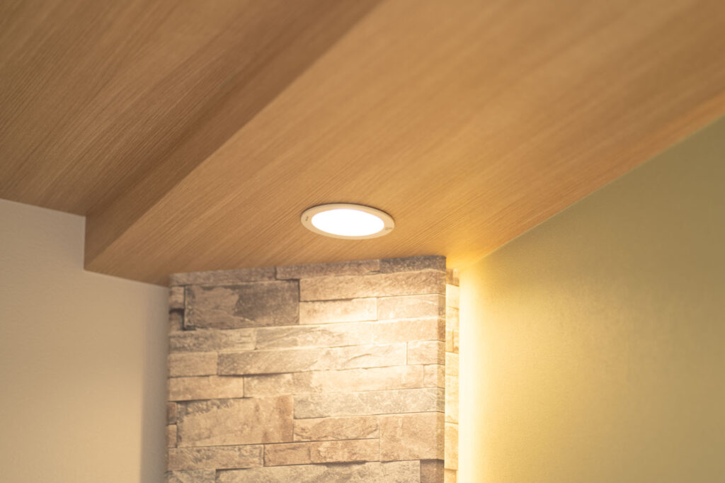 ①シーリング/照明:天井には木目調のクロスを採用し、落ち着きを感じる雰囲気に仕上げました。2基のダウンライトを利用することで、眩しすぎず、暗すぎない空間を再現しています。